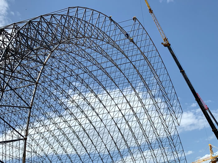 (2)网架加工前应对现场尺寸进行复测,确认无误后方可进行加工、安装;网架制作、运输、安装应遵守《空间网格结构技术规程》JGJ7-2010、《钢网架临江螺栓球节点》JG/T 10-2009、《钢网架临江螺栓球节点用高强度螺栓》 GB/T 16939-2016、《临江钢结构临江工程临江施工规范》 GB50755-2012、《临江钢结构临江工程施工质量验收标准》 GB50205-2020。